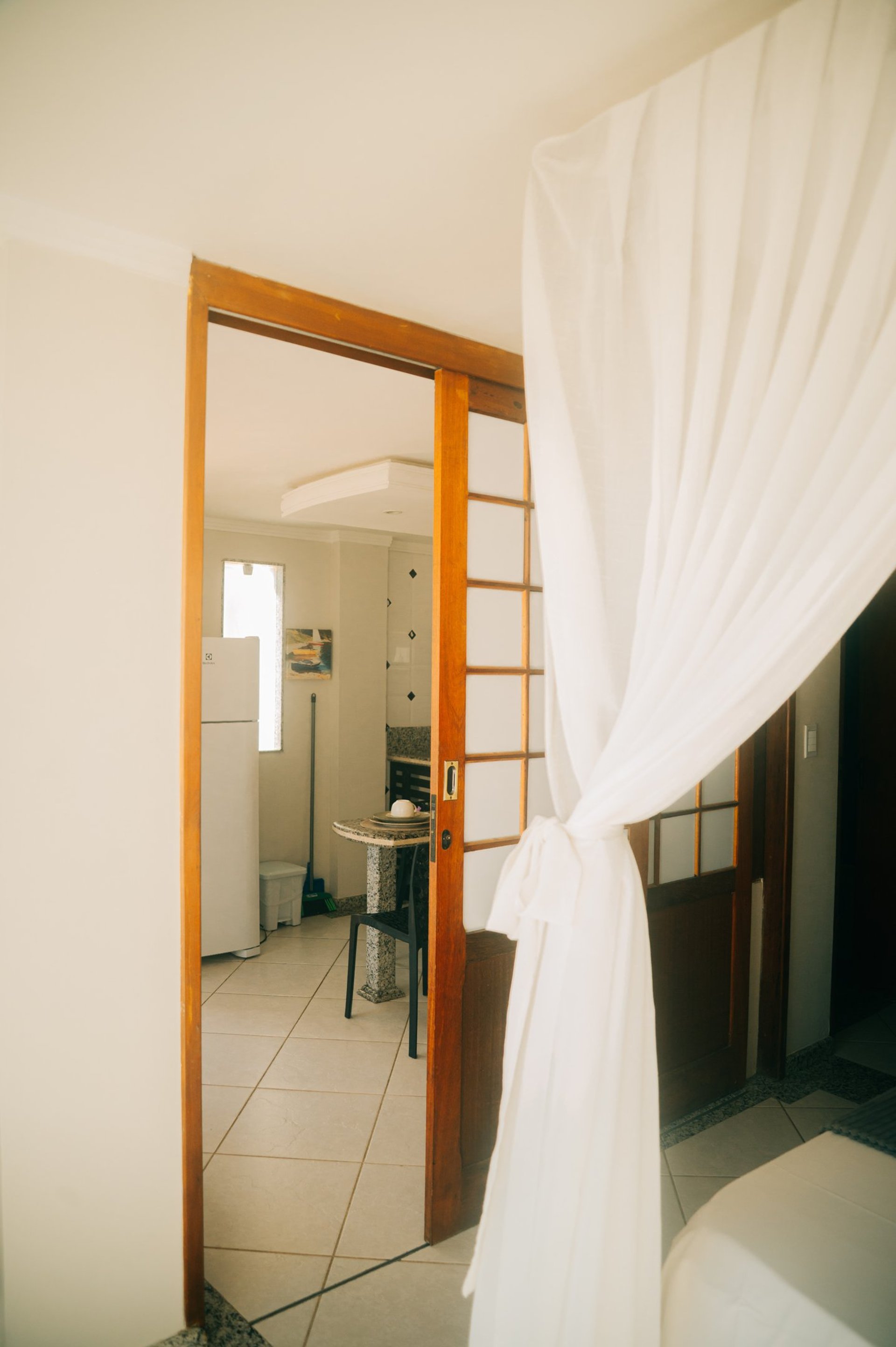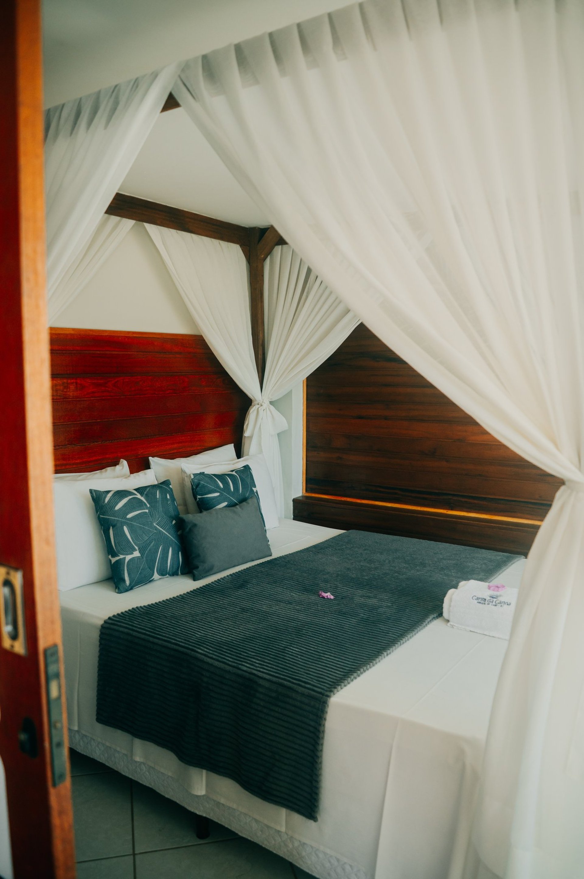 A Suíte 01 é a maior do Canto da Canoa Suítes, capacidade para até 3 hóspedes. Conta com cama queen, sofá-cama, ar-condicionado, TV, frigobar, micro-ondas e utensílios de cozinha.