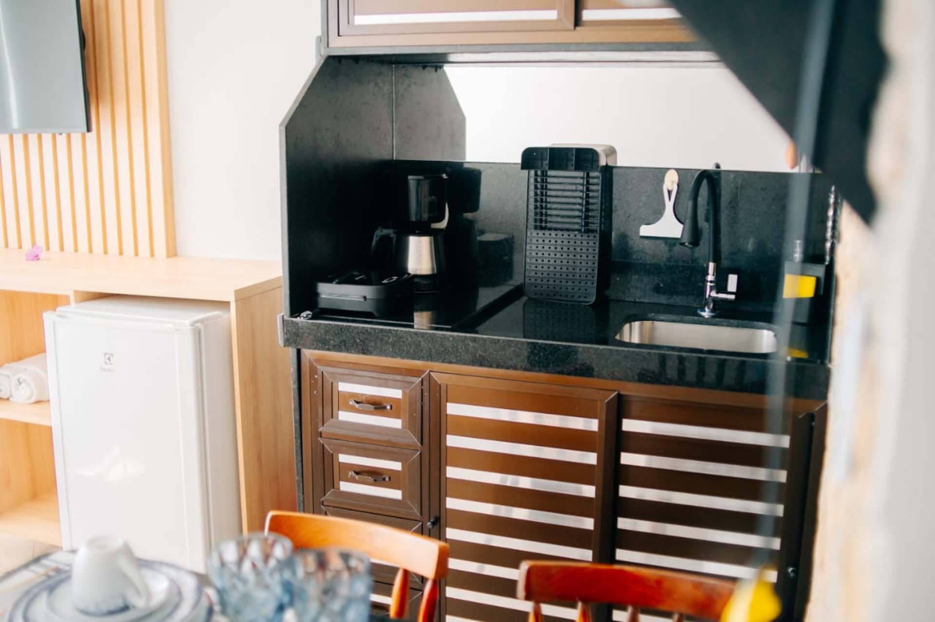 Não oferecemos café da manhã, mas todas as suítes possuem mini-cozinha (sem fogão) equipada para maior autonomia e praticidade.