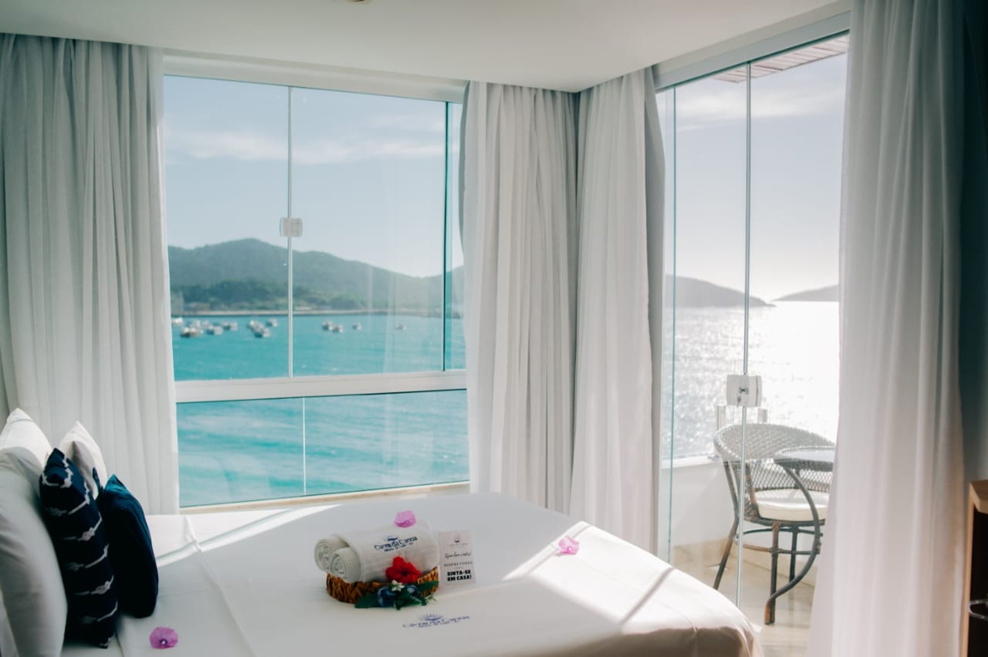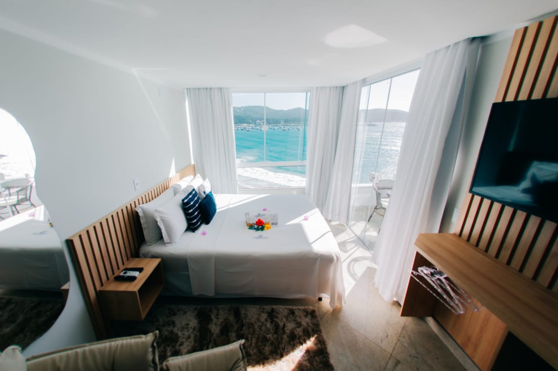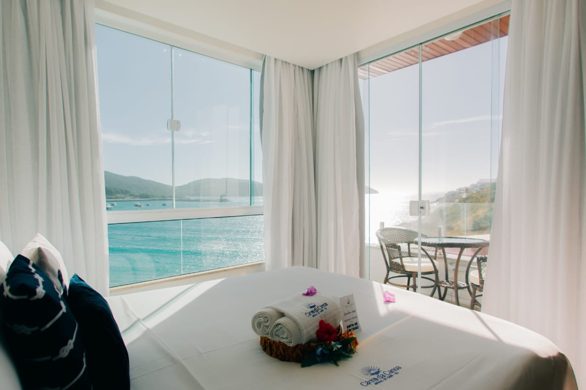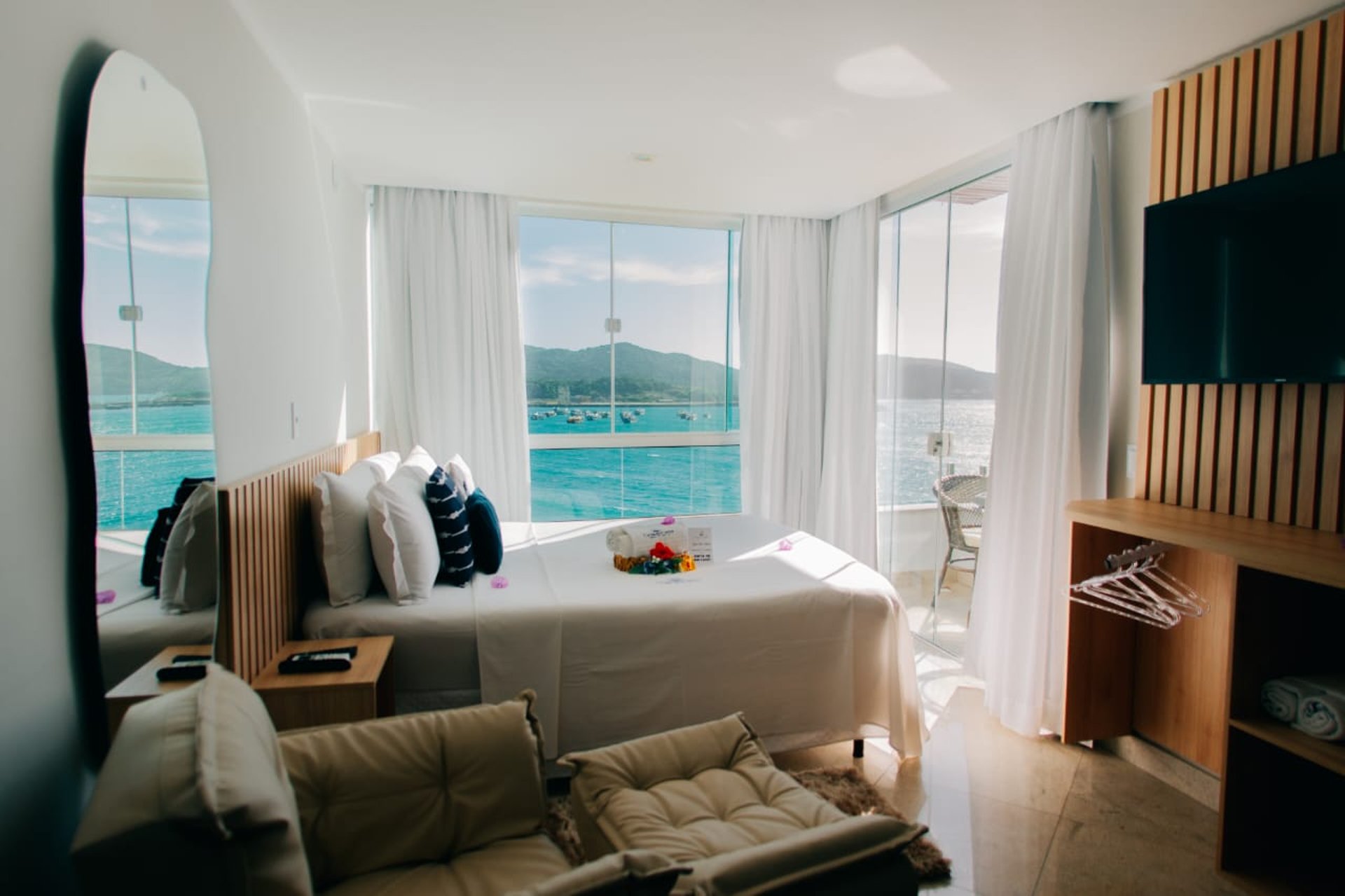 Seu grande diferencial é a sacada privativa com mesa e cadeira, perfeita para começar o dia apreciando a vista do mar. A ampla janela em formato de “L” garante luminosidade natural e uma experiência única de contemplar as águas cristalinas de Arraial do Cabo.