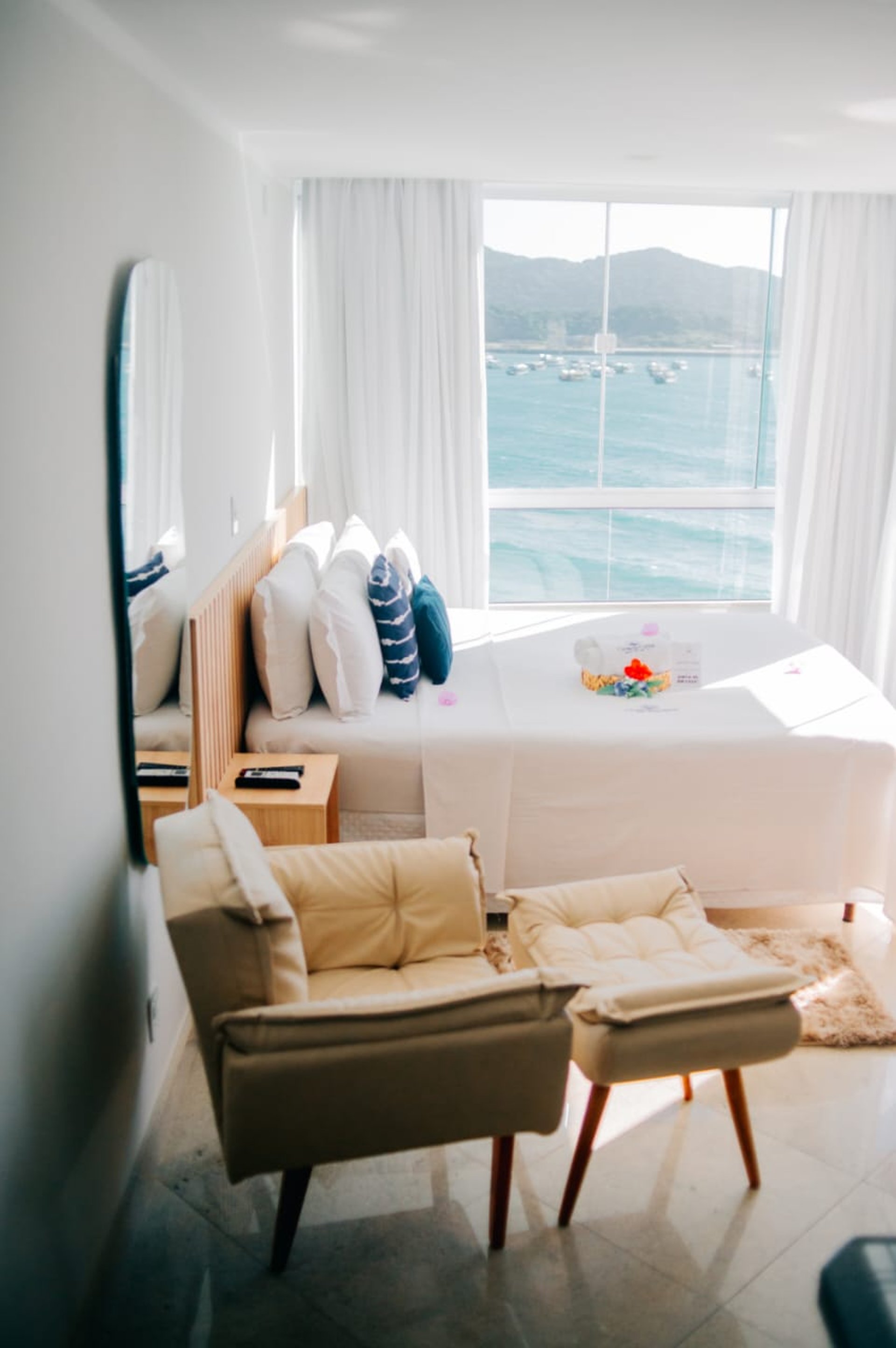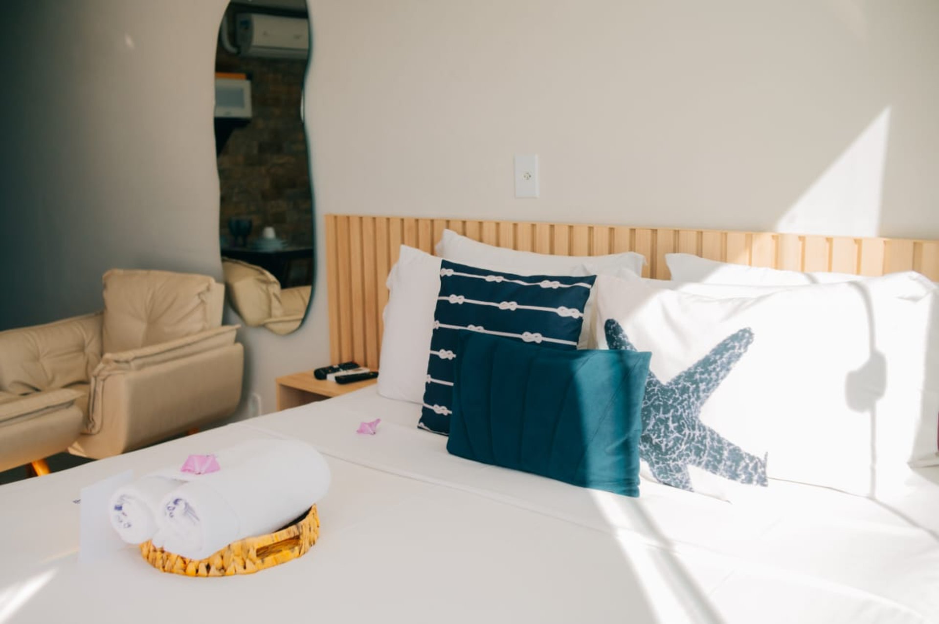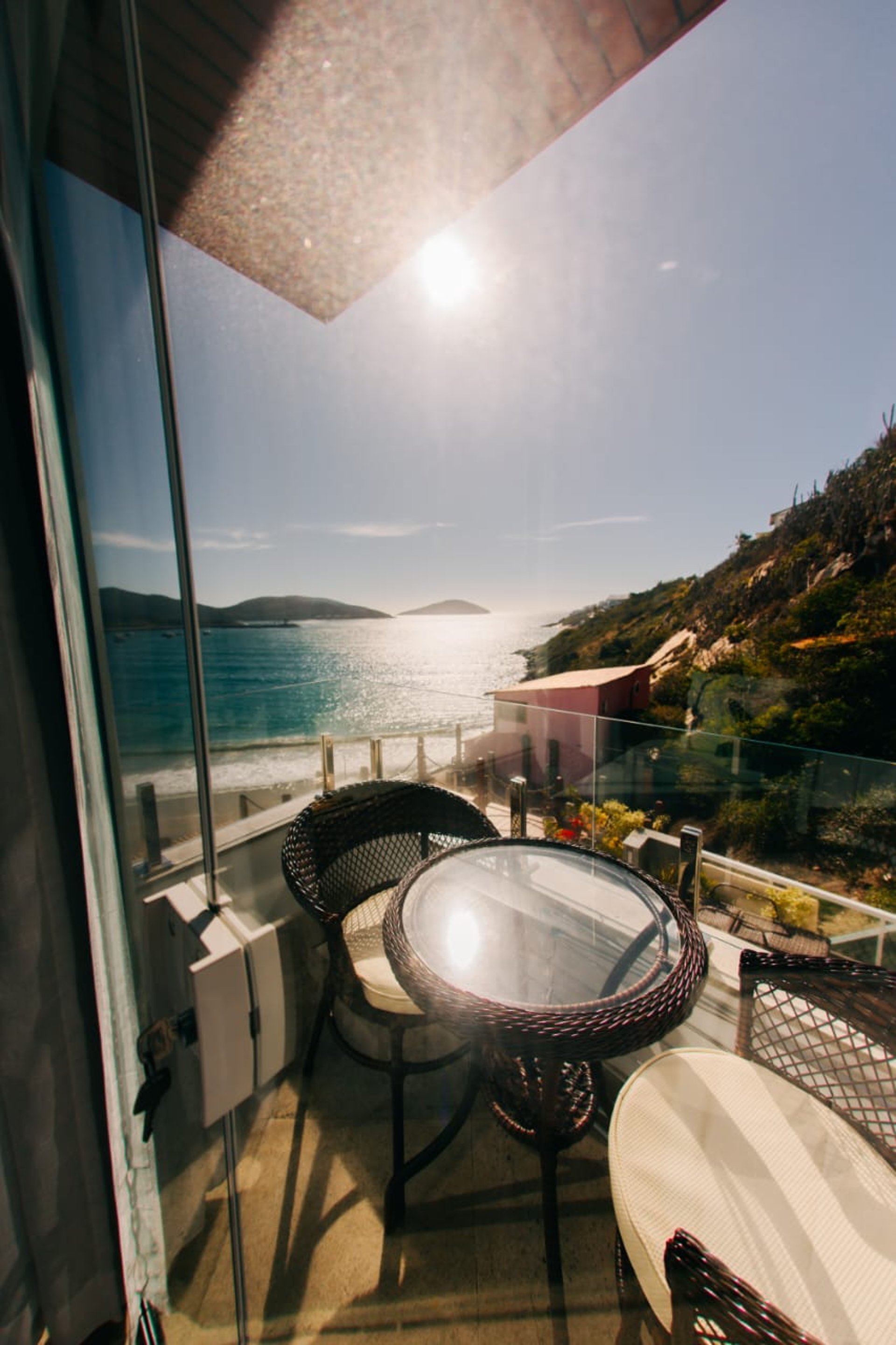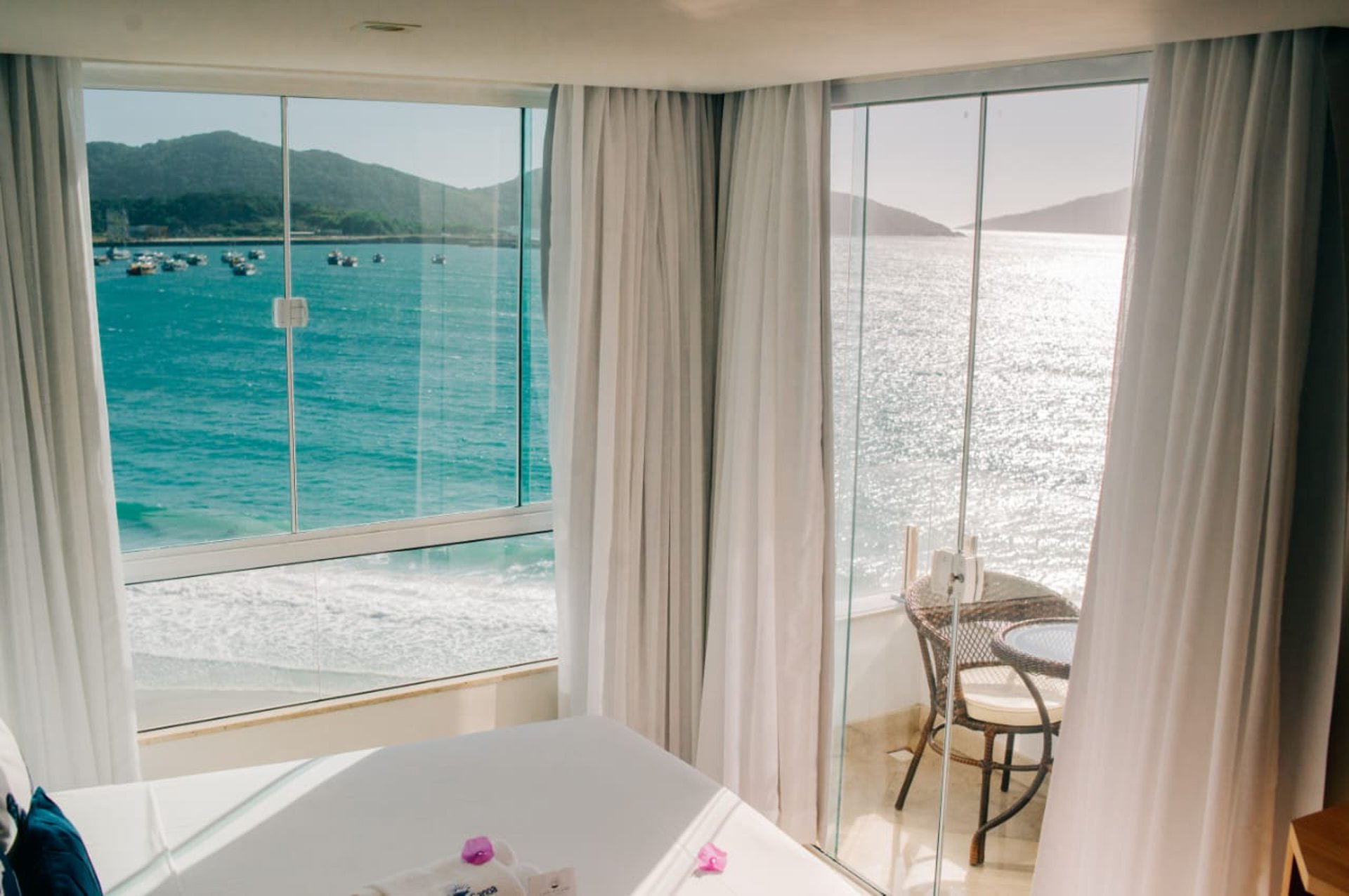 Seu grande diferencial é a sacada privativa com mesa e cadeira, perfeita para começar o dia apreciando a vista do mar. A ampla janela em formato de “L” garante luminosidade natural e uma experiência única de contemplar as águas cristalinas de Arraial do Cabo.