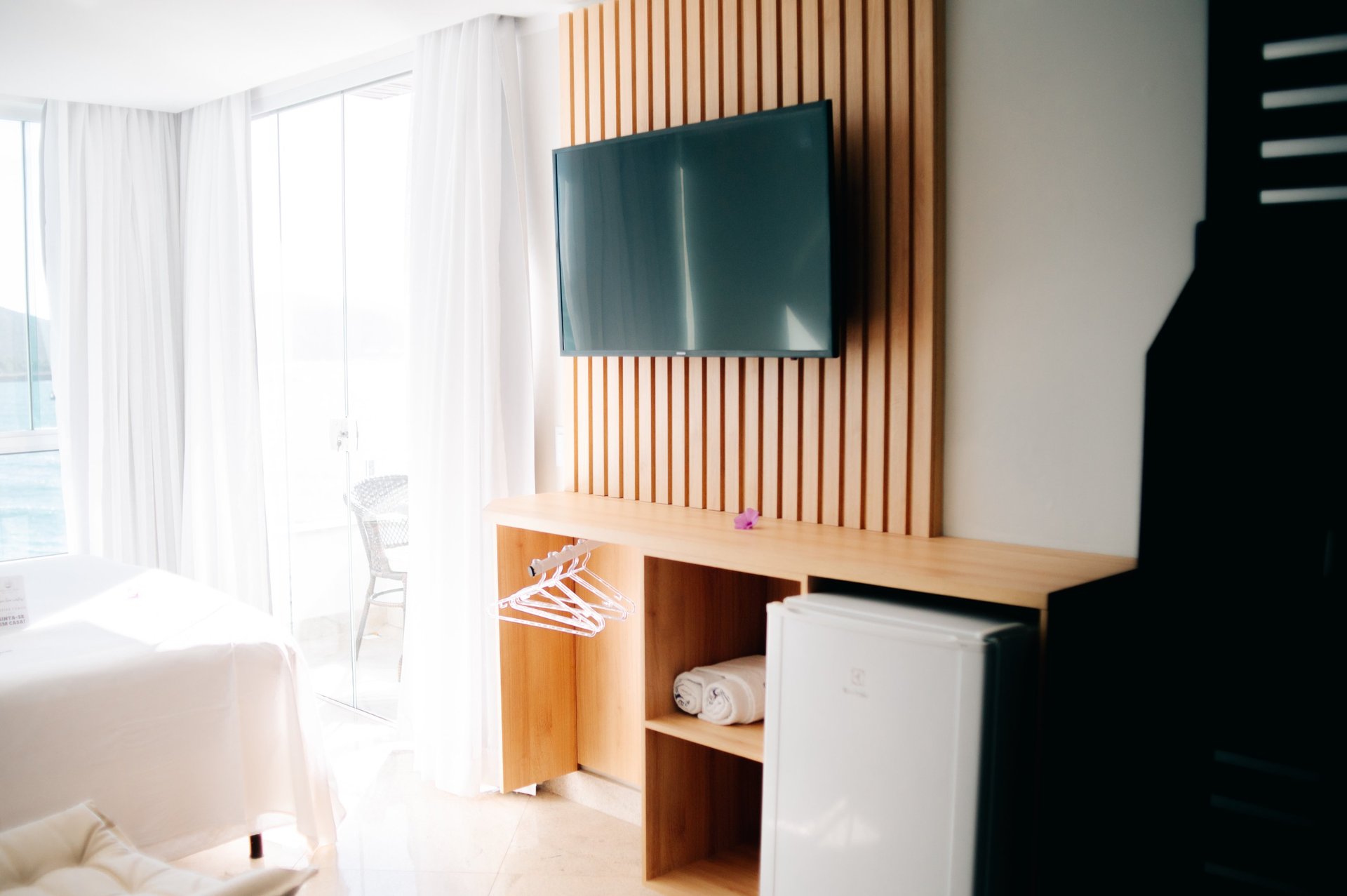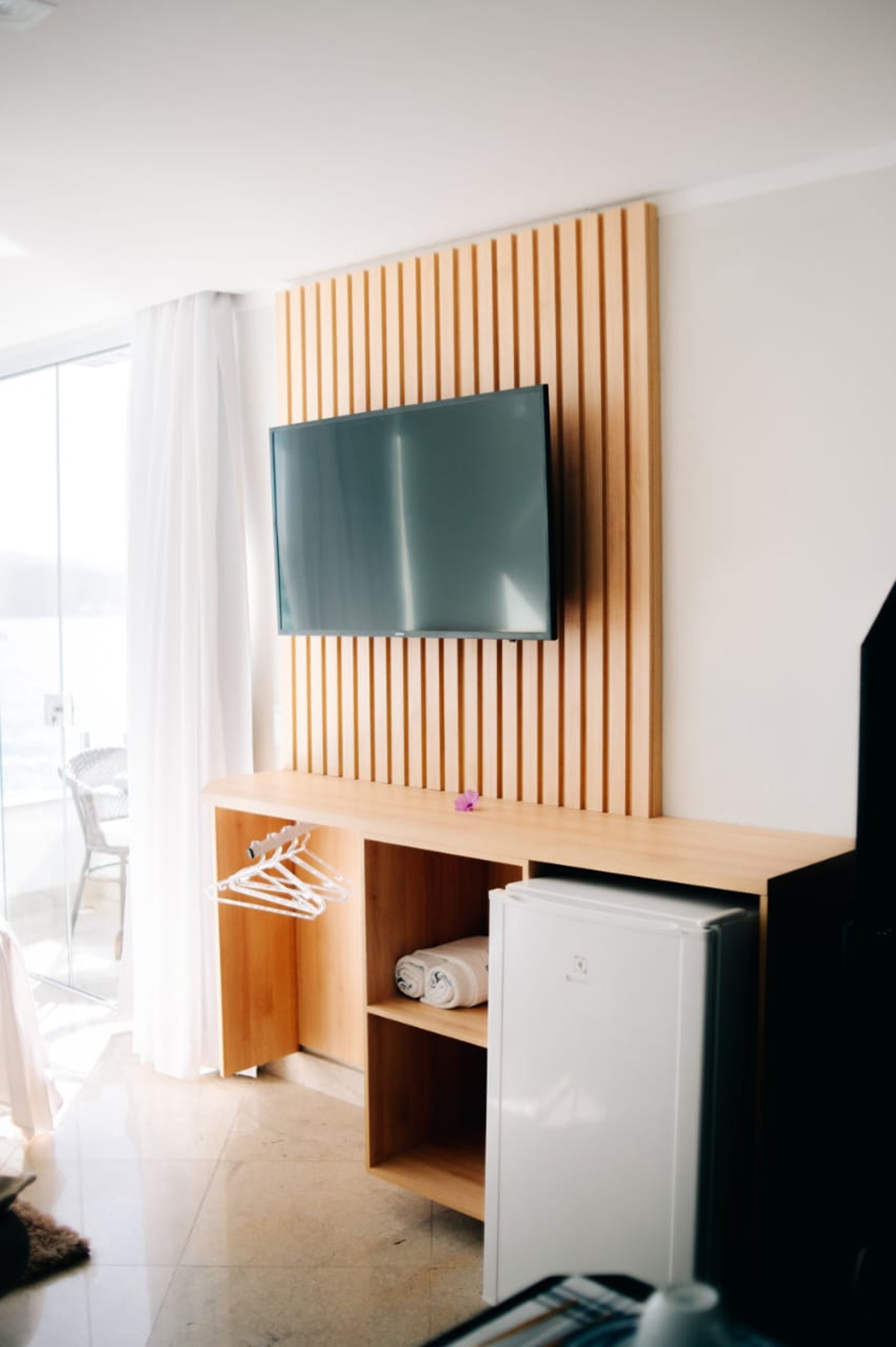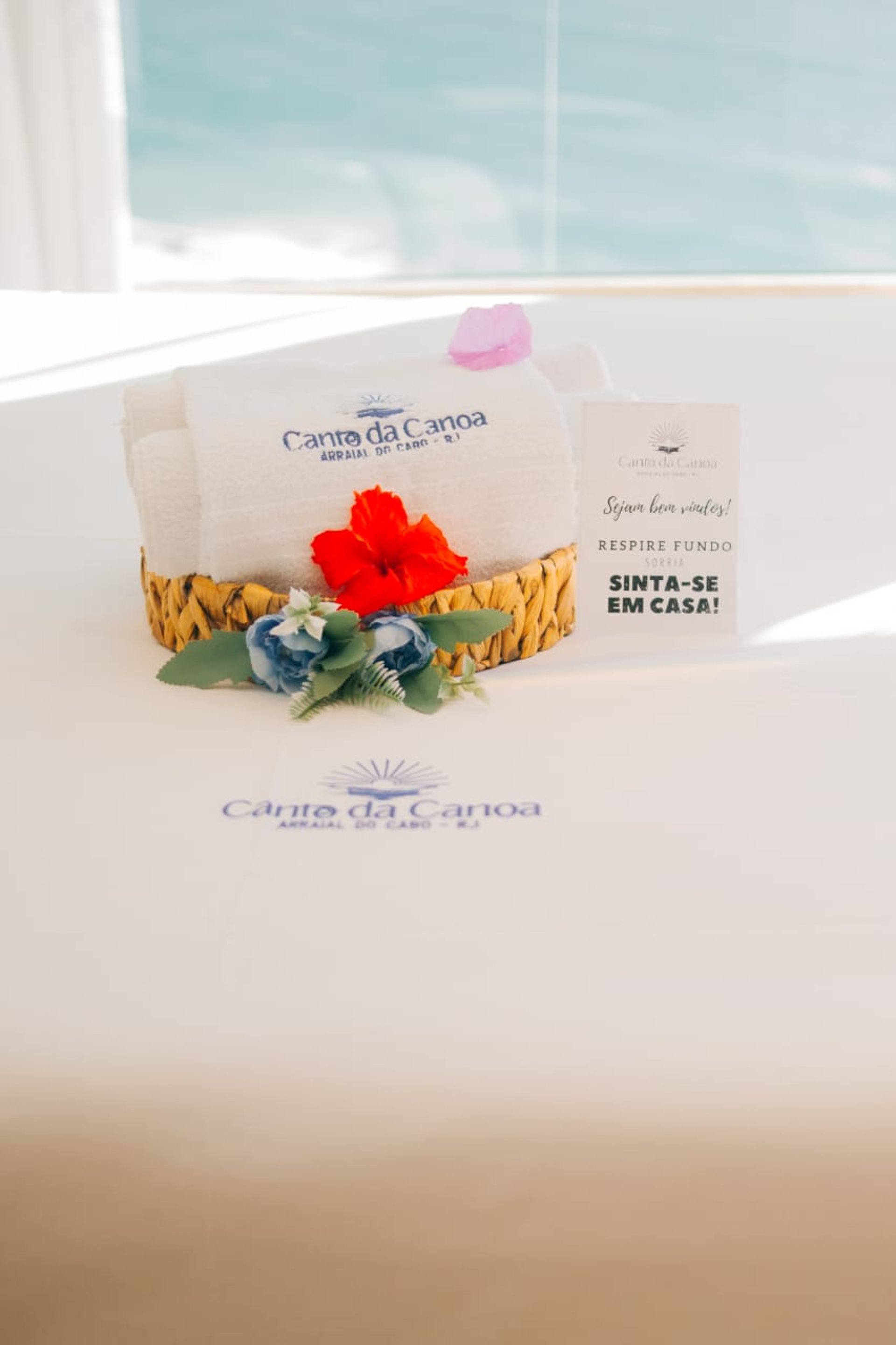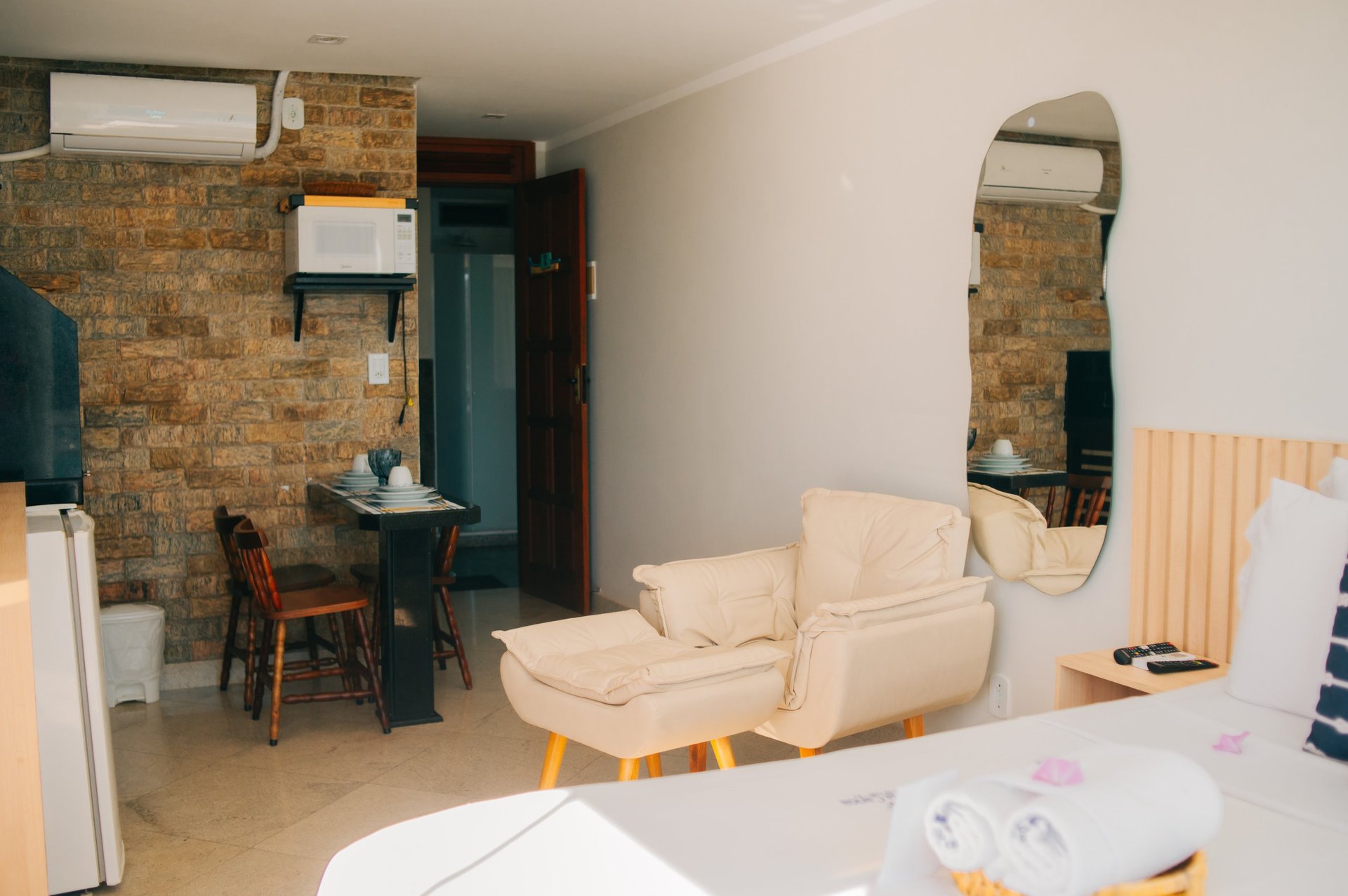 Seu grande diferencial é a sacada privativa com mesa e cadeira, perfeita para começar o dia apreciando a vista do mar. A ampla janela em formato de “L” garante luminosidade natural e uma experiência única de contemplar as águas cristalinas de Arraial do Cabo.