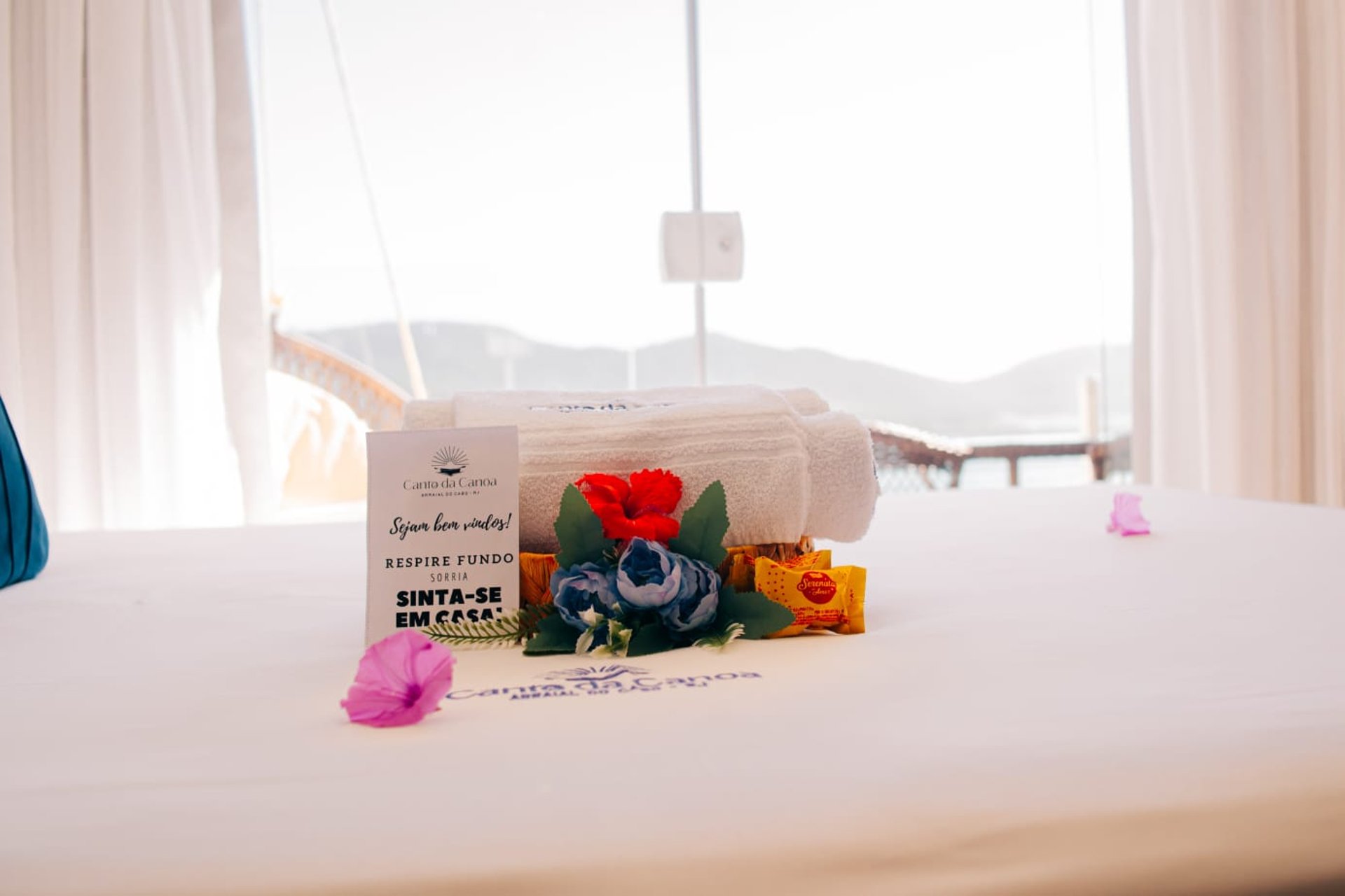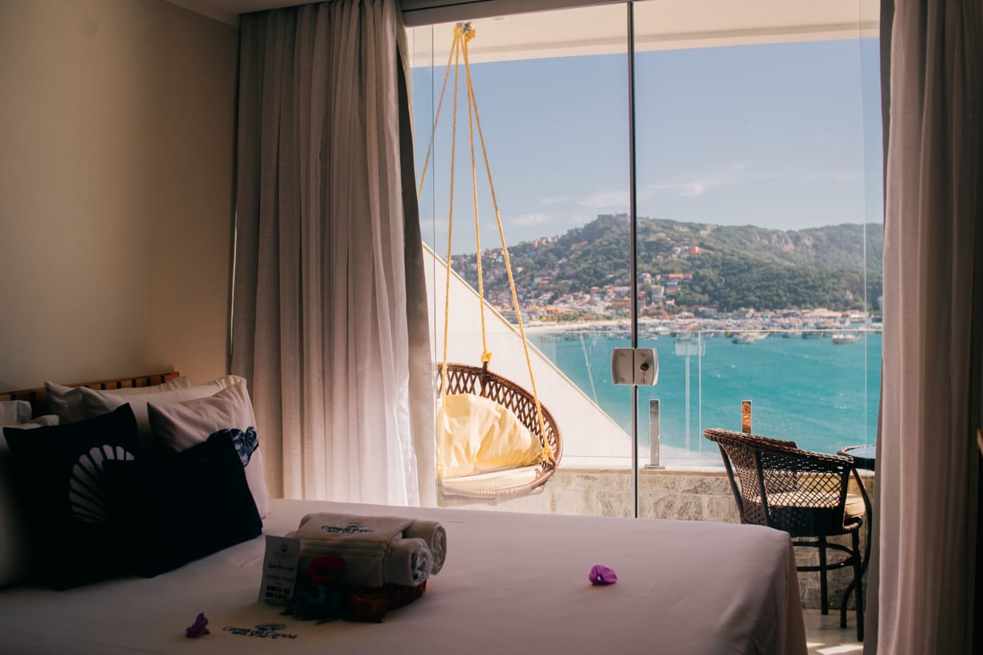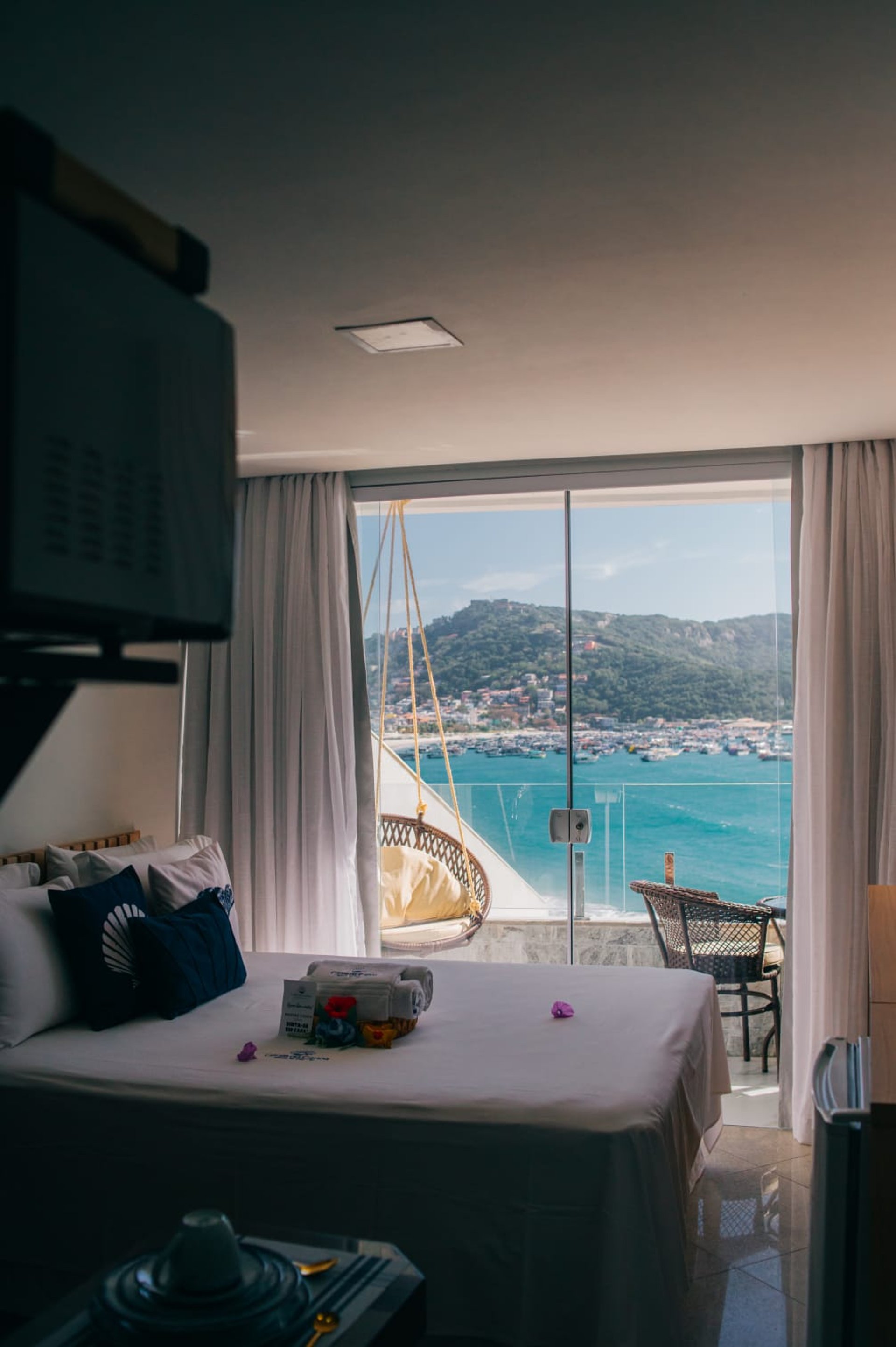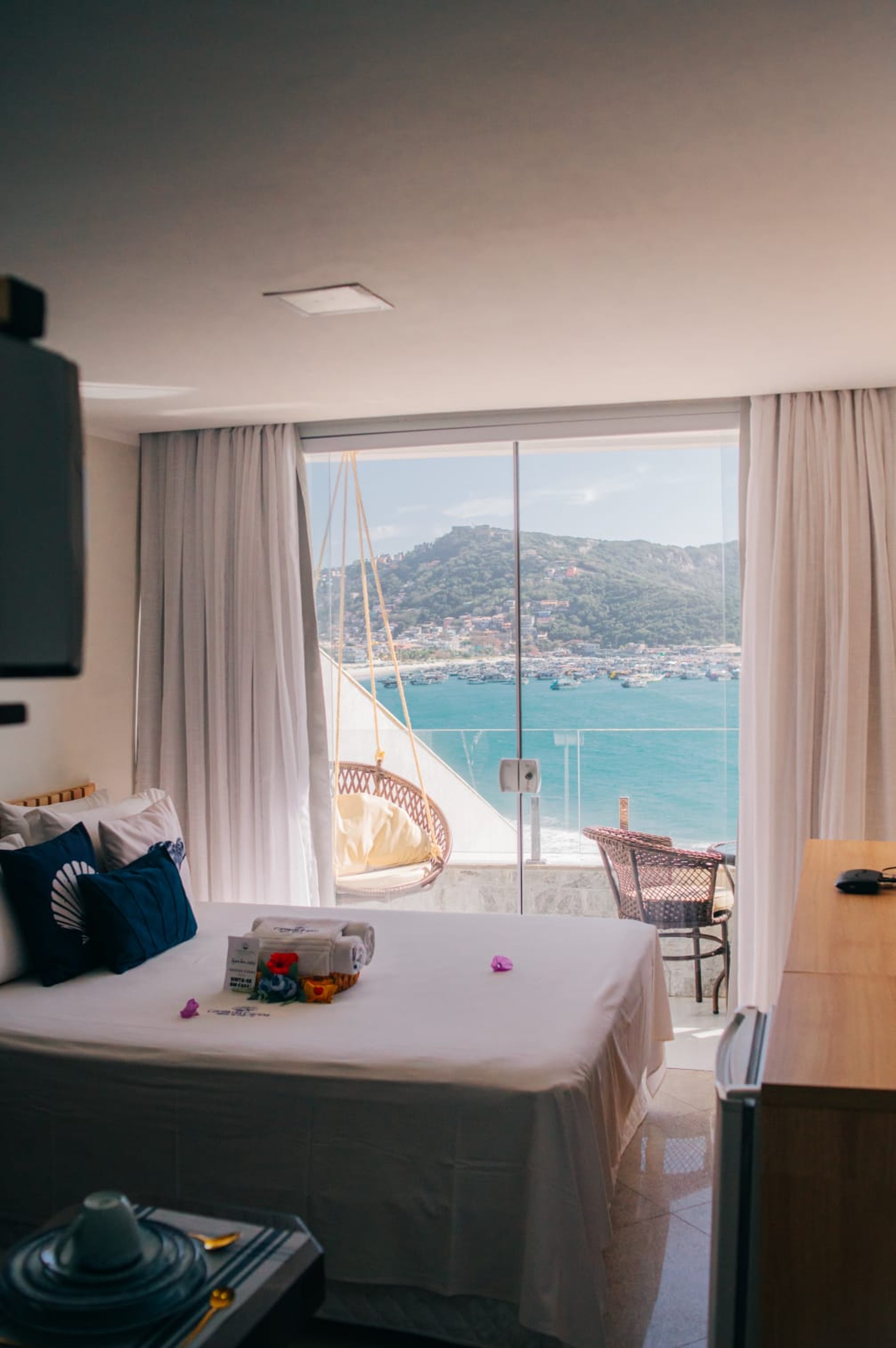 O diferencial está na proximidade da cama com a janela, que permite dormir ao som das ondas e acordar com um nascer do sol inesquecível sobre o mar de Arraial do Cabo.