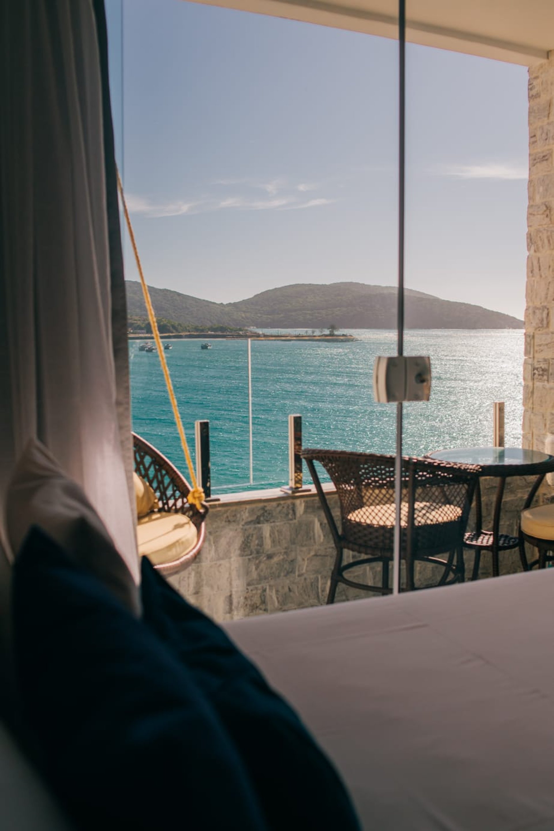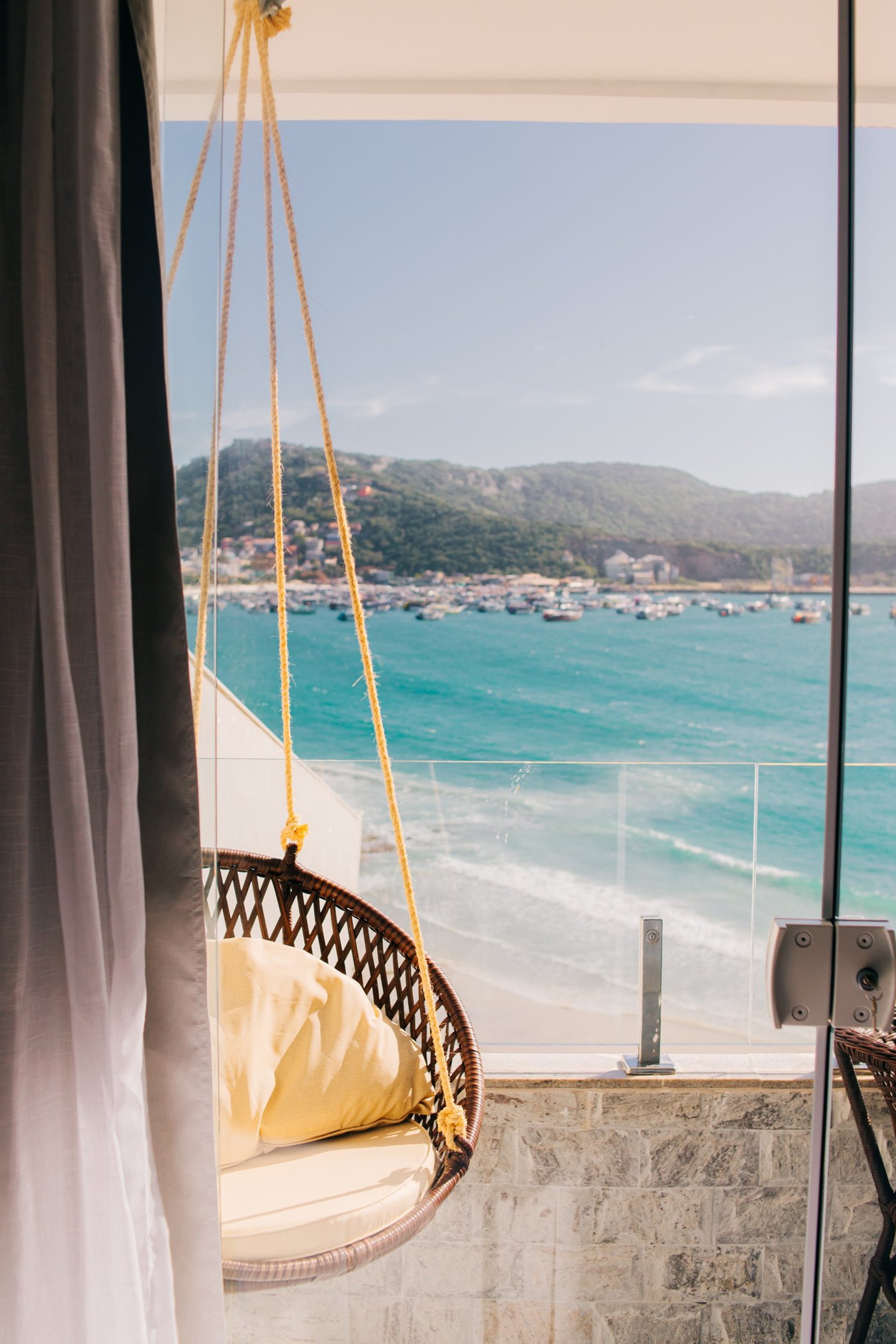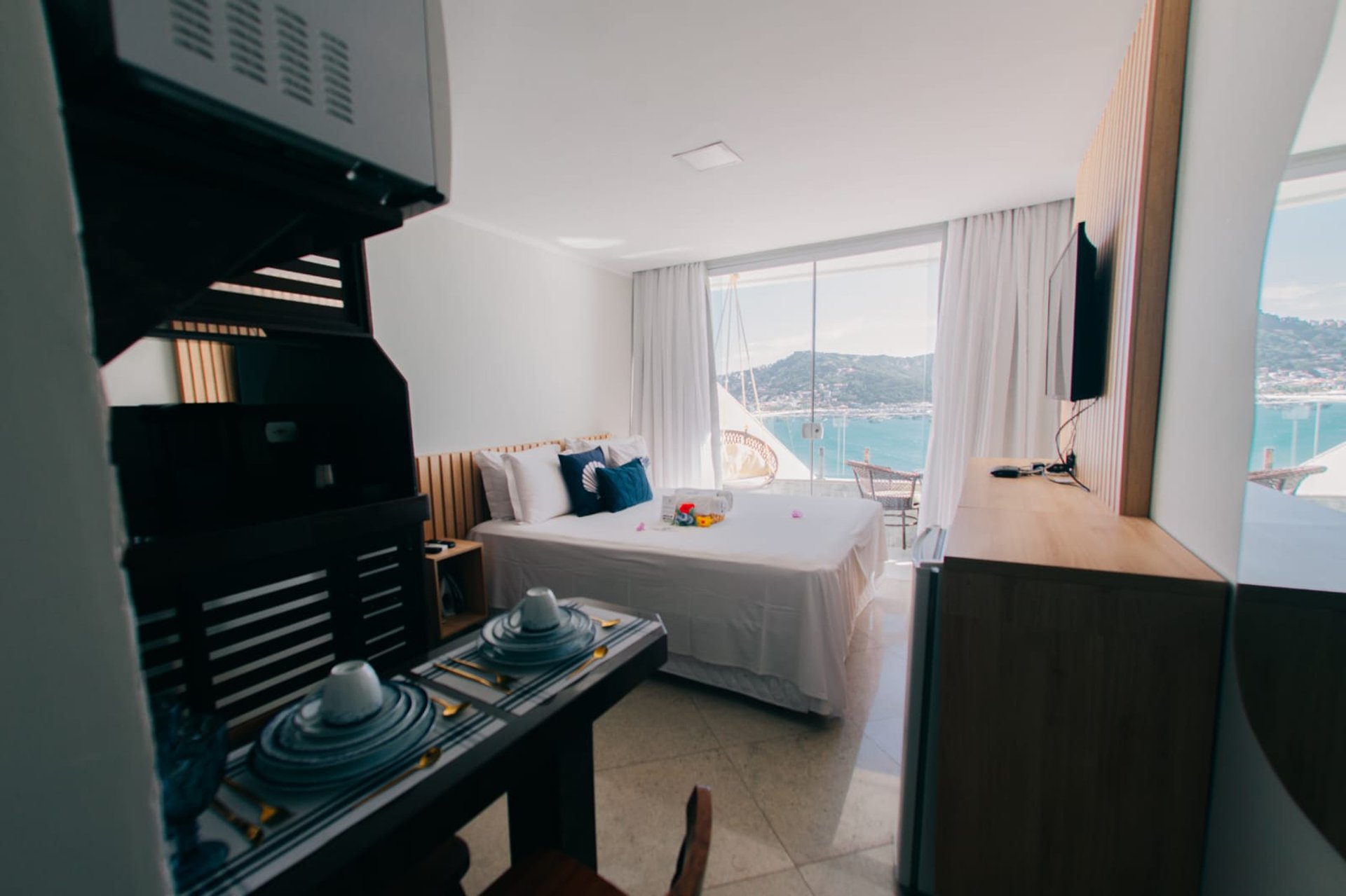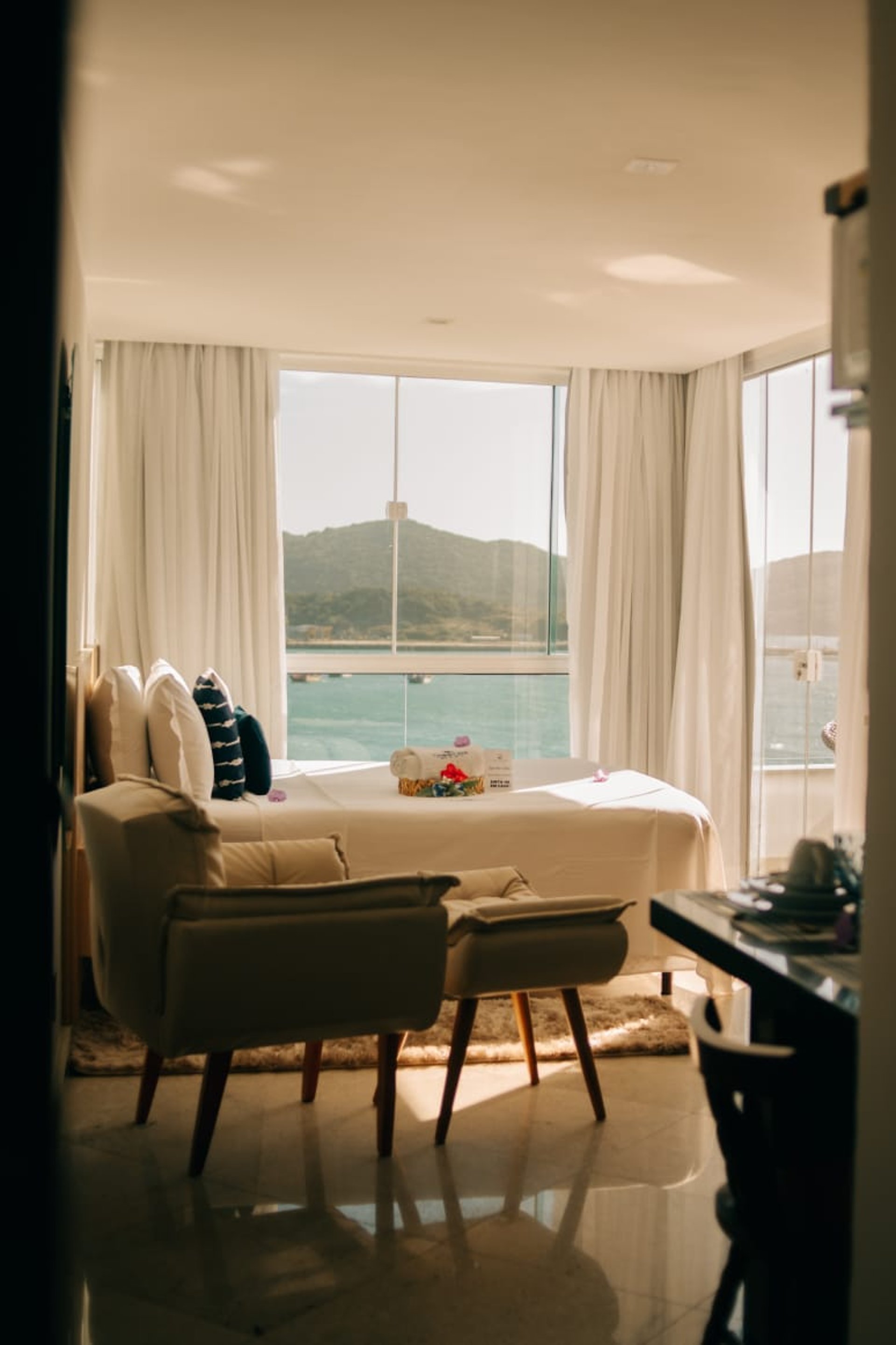 O diferencial está na proximidade da cama com a janela, que permite dormir ao som das ondas e acordar com um nascer do sol inesquecível sobre o mar de Arraial do Cabo.