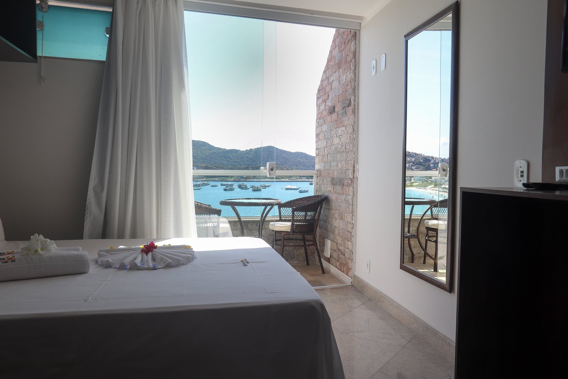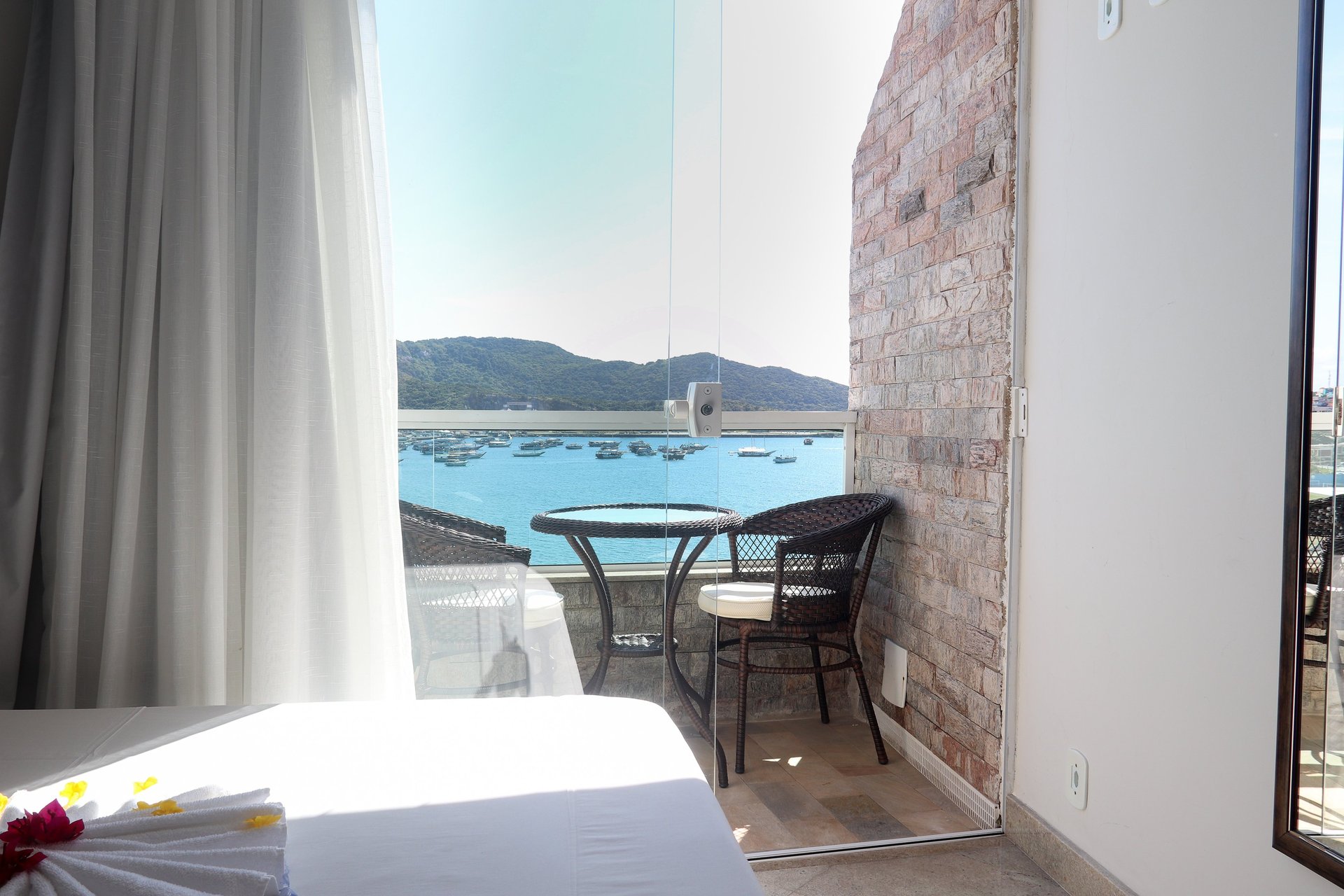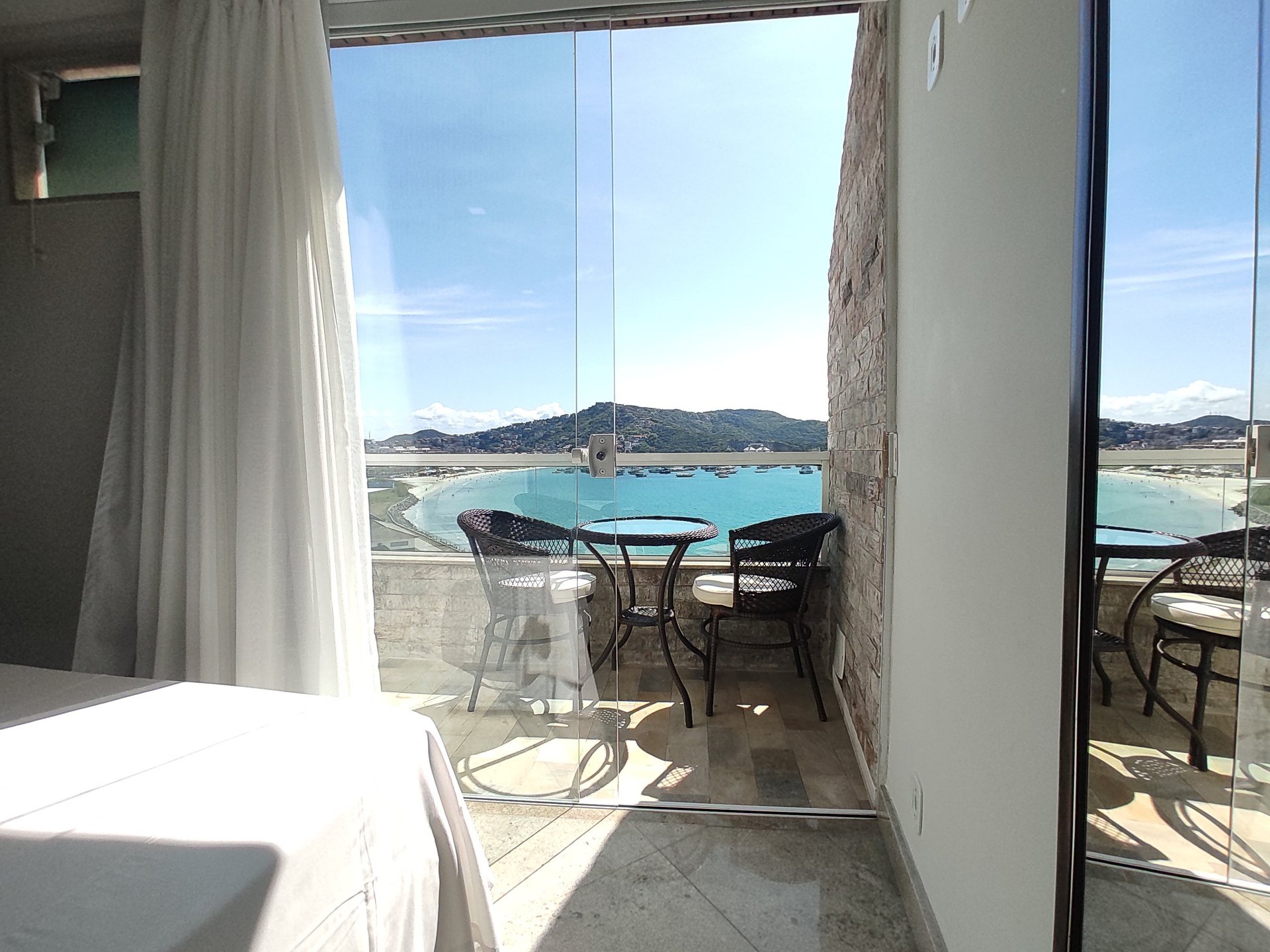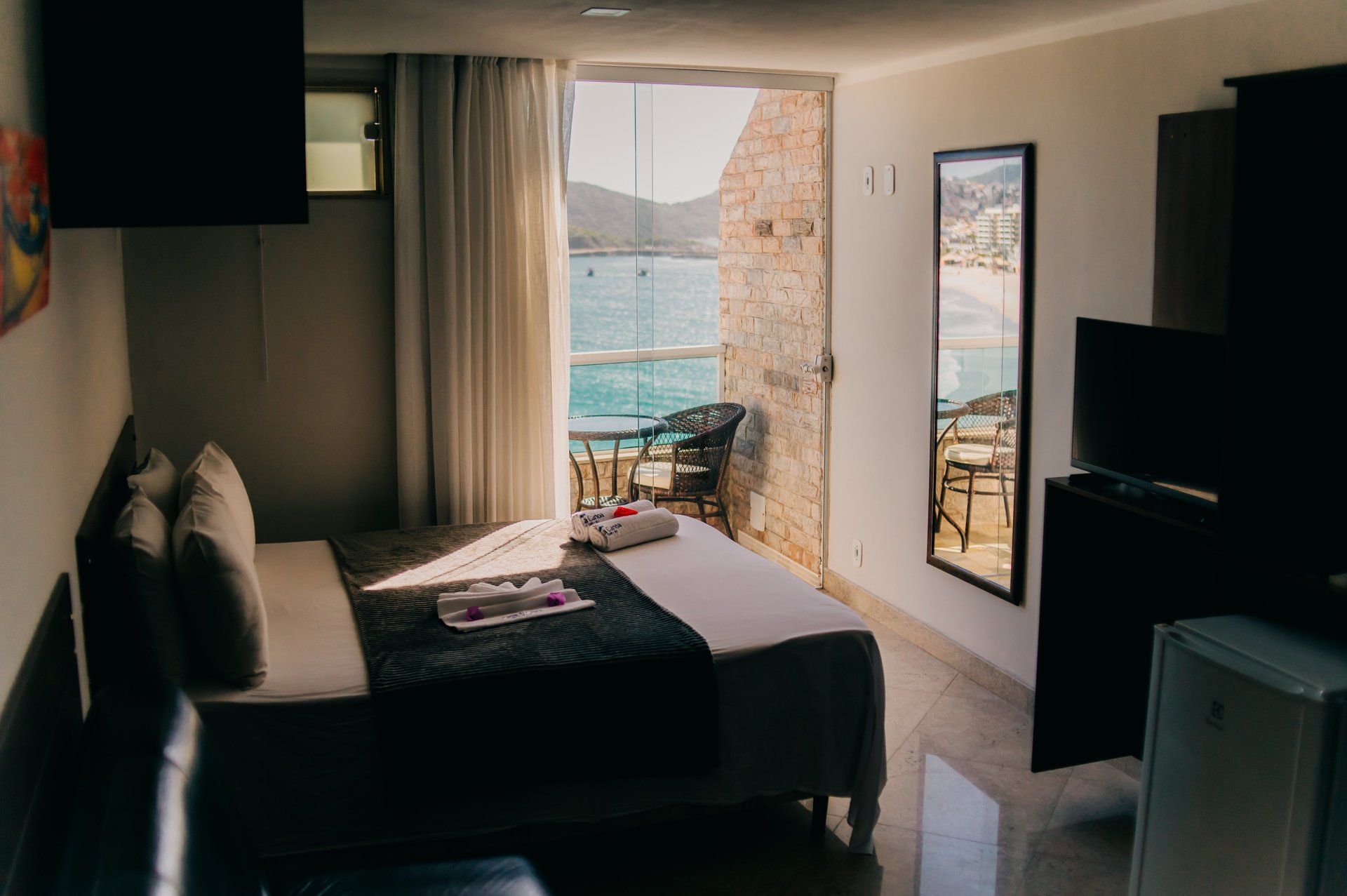 Seu diferencial está nas janelas e sacada próximas à cama, que permitem aproveitar ao máximo a vista deslumbrante da Praia dos Anjos e acordar com o nascer do sol iluminando o quarto.